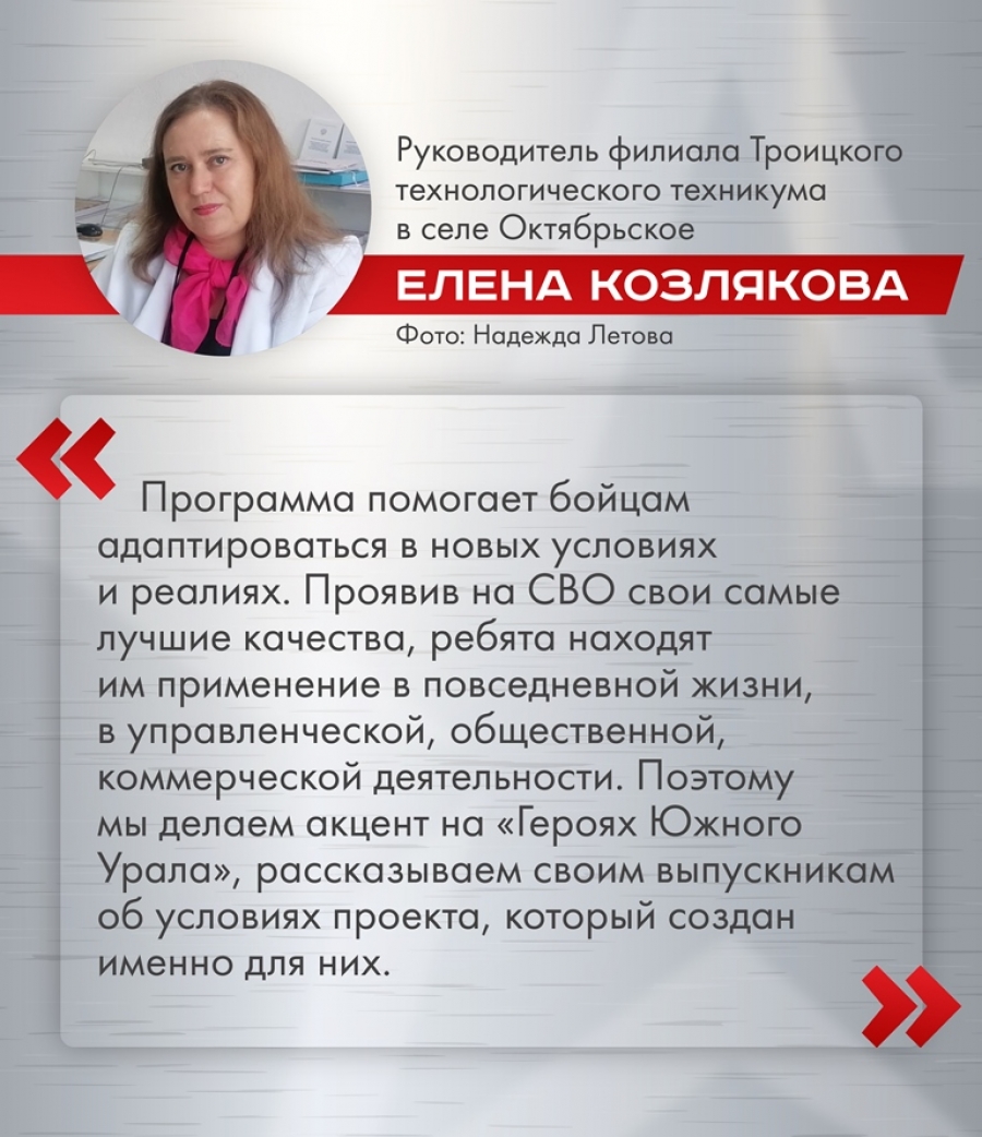 Всё это предусмотрено в годовой программе «Герои Южного Урала». По окончании обучения выпускники получат дипломы гособразца и возможность трудоустройства в различные структуры Южного Урала. Именно они будут развивать наш регион и страну в целом.